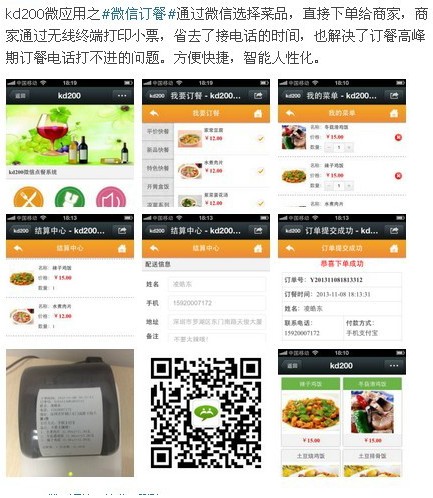 悦兮科技又在大家不断关注下我们又开发新功能:kd200微应用通过微信选择菜品,选择下单给商家,商家通过无线端打印小票,省去了接打的时间,也解决订餐高峰订餐打不进来的问题,方便快捷,智能人性化!